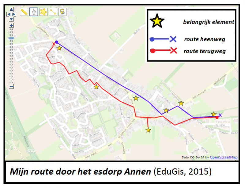 De blauwe lijn is mijn heenweg door het dorp. De rode lijn is de terugweg. De routes beginnen bij het bolletje en eindigen bij het kruisje. De gele sterren staan voor belangrijke elementen van het dorp die ik tijdens mijn route onderzocht heb. Zoals te zien is op de kaart, zijn er zeven sterren. Er zijn echter tien belangrijke elementen die ik onderzocht heb. De overige drie elementen zijn cultuureigenschappen en een belangrijk persoon voor Annen. Dit zijn geen tastbare elementen en deze zijn dan ook niet weergegeven op het kaartje.