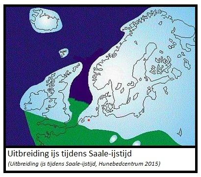 De stenen van hunebed D9 zijn waarschijnlijk in het voorlaatste glaciaal in Drenthe terecht gekomen. Dit glaciaal wordt ook wel het Saalien genoemd en heeft vanwege haar lage temperaturen een groot deel van Nederland met ijs bedekt. De afbeelding hiernaast (Hunebedcentrum Borger, http://www.hunebedcentrum.eu/museum/keientuin/ ) geeft de situatie weer van ongeveer 150.000 jaar geleden. Als u op de afbeelding klikt, wordt deze groter. De witte vlakken stellen de ijsbedekking voor, de rode stip is ongeveer de locatie van Annen. Deze ijsbedekking heeft vanaf Scandinavië grote stenen meegenomen en onderweg afgerond. Deze stenen zijn later onderdeel geworden van hunebedden.